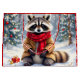 Saco de presente de Natal super fofo que tem uma ilustração do estilo aquarela de um guaxinim festivo sentado numa floresta de neve branca durante um dia de inverno com um pano de fundo de pinheiros decorados em férias.
