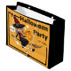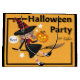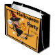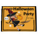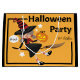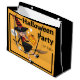 Ilustração de uma bolsa do Festa de Halloween, com uma bruxa de desenho montando uma vassoura. Ela está vestida com um chapéu de bruxa preta com listras vermelhas, um vestido preto e meias listradas vermelhas e brancas. Ela segura um jack-o-lanterno brilhante numa mão. O fundo é laranja com a palavra "Halloween".