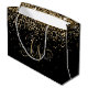 Glitter Dourado, Glitter Elegante Monograma Bag. Personalize facilmente este design de sacola de presente chic com tendências, apresentando uma brilhante brilha dourada elegante num fundo preto. O design apresenta seu monograma manuscrito com espirais bonito e seu nome.