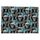 Os crânios de cinza e as flores azuis são a característica deste saco-presente único e atraente. O padrão é colocado sobre um fundo preto dramático. Ambos os lados da bolsa têm a mesma imagem.