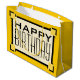 Uma bolsa de presente de aniversário feliz ousada para dar aos amigos ou à família. Esta Dourada "Arte Geométrica Deco Feliz Aniversário Gift Bag" tem três tons de ouro e linhas pretas.