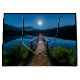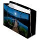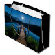 Uma bolsa de presente com uma bela fotografia de um píer de madeira esticado sobre um lago calmo. O céu noturno coberto de estrelas e uma bela lua de cheio.