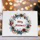 Um elegante design de coroa de inverno com flores de Natal, cones de pinho e bagas de inverno num galho de abeto.