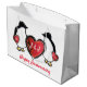 Grande saco de presente de aniversário de casamento personalizado com pinguim ilustrado e design de coração. Perfeito para casais que estão comemorando seu aniversário de rubi. Esta design tem espaço para as iniciais do marido e da esposa, assim como para a data de casamento. A mensagem e o número de aniversário também podem ser alterados.