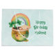 Um saco de presentes com uma ilustração adorável com um sorridente pote verde e dourado com um arco-íris fofo, uma nuvem feliz e um trevo verde.