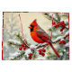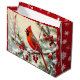 A beautiful Christmas gift bag with an illustration of a red cardinal on a pine tree branch with red berries and snow.