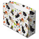Pugs bonitos em trajes de Halloween e trick-or-tratando com estampas de pata, morcegos e ossos de cães em fundo branco.