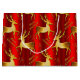 Um belo saco de presente de Natal e ouro vermelho com um padrão colorido de renas de ouro. À volta das renas estão pequenas flores de neve ouro, e a saudação tradicional de Natal ouro do "Feliz Natal". Esta bolsa elegante vai definitivamente adicionar um toque de estilo festivo e cor aos seus presentes este Natal.