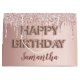 Um saco de presente para uma festa de aniversário giro e glamourosa. Um fundo rosa de ouro falso com um brilho elegante rosa de ouro brilhante, pintura pingada. O texto: O nome é escrito em ouro rosa escuro com uma escrita de estilo moderna, escrita à mão. O texto: Feliz Aniversário é escrito com uma letra estilo balão.