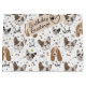 O cão-padrão encara patas e padrões sem costura de ossos, com ilustrações de ossos e patas, Caça-Basset e cabeças de Bulldog Francês em tons marrons. Comprar isto para si mesmo ou como um presente excelente para os seus amigos que amam o cão. Personalize o texto "Cartões de aniversários", as alterações de fonte e de cor.