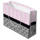 Saco de presente brilhante grande com imagem de listras cor-de-rosa na metade superior e design barroco francês preto e branco na metade inferior dividido por uma fita preta revestida com um arco preto com rosa rosa e detalhe de fita. Veja o saco de presentes médio correspondente. Veja toda a coleção Birthday Gift Bag nos TOUCHES ESPECIAIS | Seção Favoritos para festas.