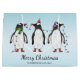 A ilustração original de Destei de três adoráveis pinguins Gentis festivos segurando luzes de Natal coloridas com seus bicos. Um pinguim está vestindo um cachecol verde, outro está vestindo a proteção do ouvido roxo e o terceiro pinguim no meio está vestindo um chapéu de Papai Noel vermelho e branco. O fundo é um gradiente azul claro. Há também duas áreas de texto personalizáveis.