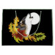 Um lobo uivando numa lua de cheio com folhas de outono e bolotas num pano de fundo de preto.
