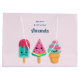 Saco de presentes com uma ilustração de 3 tratamentos de sorvete diferentes. Um picolé azul-esverdeado com gotas de morango e salpicadores coloridos. Um picolé de melancia. Um cone com camadas deliciosas de sorvete em rosa e menta. Todos com sorrisos kawaii fofos.