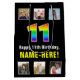 Este design de presente de aniversário divertido e otimista apresenta um grande número "11", tendo um vibrante espectro multicolorido do arco-íris inspirado em um padrão de gradiente, junto com a mensagem "Feliz 11 Aniversário", e um nome de destinatário personalizado. As fotos acima e abaixo da mensagem podem ser personalizadas, talvez com fotos do receptor, da família e dos amigos do destinatário e/ou do(s) remetente(s) do presente. Uma bolsa de presente temida de aniversário alegre como esta pode ser uma maneira divertida de embrulhar um presente dado a alguém que está celebrando seu décimo primeiro aniversário. (Fotografia © Storytree Studios, Stanford, CA.) [~Z0000669]