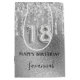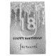 Elegante, clássica, glamourosa e feminina 18ª festa de aniversário. Um fundo metálico falso prateado. Decorado com pingos de brilho sujo, aparência de pingar tinta. Personalize e adicione um nome. Com o texto: Parabéns. O nome é escrito com um moderno estilo escrito à mão. O número 18 é escrito com uma fonte no estilo do balão.