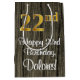 Este na moda, luxuoso e sofisticado design de bolsa de presente temático de aniversário apresenta um grande número ordinal "22" com uma imitação/aparência falsa inspirada em ouro, além da mensagem de saudação de aniversário "Feliz 22 de aniversário" e um nome de destinatário editável em uma fonte estilo script. O fundo tem um padrão falsa inspirado em madeira. Uma bolsa de presente temida de aniversário elegante como esta pode ser uma maneira divertida de embrulhar um presente ou presente para celebrar o vigésimo segundo aniversário de alguém. [~Z0000520]