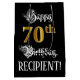 Este elegante e rico de bolsa de presente de aniversário apresenta a mensagem "Feliz 70 de Aniversário", juntamente com um nome de destinatário editável. Parte da mensagem está em um texto elaborado no estilo de script. O grande número "70" apresenta um padrão de aparência falsa/imitado inspirado em ouro. O fundo é preto colorido. Um saco de presentes temático de aniversário como este pode ser uma maneira respeitável de embrulhar um presente ou de apresentar a alguém que comemora seu setuagésimo aniversário. [~Z0000560]