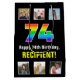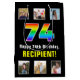 Este alegre e alegre design de bolsa de presente temático de aniversário apresenta um grande número de "74", tendo um vibrante espectro multicolorido do arco-íris inspirado num padrão de gradiente, além da mensagem "Feliz 74.º Aniversário", e um nome de destinatário personalizado. As fotos acima e abaixo da mensagem podem ser personalizadas, talvez com fotos do receptor, da família e dos amigos do destinatário e/ou do(s) remetente(s) do presente. Um saco de presentes temáticos de aniversário ocular como este pode ser uma forma divertida de embrulhar um presente que está a ser dado para celebrar o setenta e quarto aniversário de alguém. (Fotografia © Storytree Studios, Stanford, CA.) [~Z0000669]
