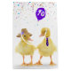 Casal de patinação felpudo amarelo, em forma de fundo branco, com um balão de aniversário de 70 roxo. A cor de fundo pode ser alterada. A idade pode ser alterada.