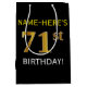 Este simples design de presente de aniversário apresenta uma mensagem personalizada como "NAME-HERE'S 71rua BIRTHDAY!" (com a "71ruas" a ter um visual falsa/imitado de cor dourada) sobre um fundo de cor preta. O nome está em texto em negrito de cor amarela e pode ser personalizado. Uma bolsa de presente de aniversário personalizada como esta poderia talvez ser usada quando se dá um presente a alguém que comemora seus setenta anos de primeiro aniversário. [~Z0000252]