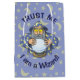 Um velho feiticeiro com capa azul olhando para a bola mágica de cristal.