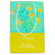 Saco de presente de aniversário feliz, tamanho médio com fundo floral e padronizado, cores são limão de limão e lacre. Personalize o texto para se adequar a qualquer ocasião especial.