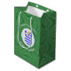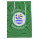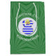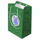 Saco médio com um anjo loiro vestindo a bandeira da Grécia para decoração de presentes de Natal ou decoração de Natal. O anjo da bandeira grega encontra-se dentro um fractal circular branco de quadrados rabugentos. O fundo é um fractal verde de quadrados pretos. Adicione seu próprio texto ou personalize com um nome e o ano. Compartilhe sua herança nesta temporada de festas.