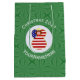 O saco de presente médio apresenta um anjo vermelho de cabelo vestindo a bandeira dos Estados Unidos da América para decoração de presentes de Natal ou decoração de Natal. O anjo de Natal da bandeira dos EUA é encontrado dentro um fractal circular branco de quadrados rabugentos. O fundo é um fractal verde de quadrados pretos. Adicione seu próprio texto ou personalize com um nome e o ano.