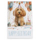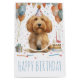 Ótima ilustração cartoon de Cães de Goldendoodle vestindo um chapéu de aniversário ao redor de um bolo de aniversário e balões. Perfeito para amantes de animais de estimação ou pais de cães.