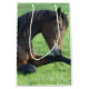 Saco de presentes com uma bela fotografia, com um belo cavalo marrom, deitado na grama, com aparência pacífica e contente.