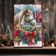 Saco de presente de Natal. Um bonito cavalo marrom e branco atrás de uma cerca de madeira rústica com uma coroa festiva sobre ela. Ao fundo está um velho celeiro vermelho rústico.