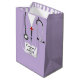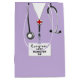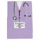 Saco único de prenda de enfermeira com esfregões de hospital de lavanda, estetoscópio e grandes felicitações. Editar texto para adicionar o nome da enfermeira.