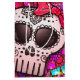 O tom de joias faux brilha por trás dos crânios de açúcar preto e branco. Um crânio feminino com arco vermelho rubi está de um lado da bolsa de presentes. Por outro lado, um crânio de açúcar masculino ostenta uma gravata de arco vermelho cintilante. Muito fofo! Divertido!