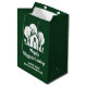 Esta bolsa de presente verde da empresa de imóveis florestais é perfeitamente personalizada para um corretor de imóveis especializado em casas perto da natureza ou florestas. A silhueta branca das árvores atrás de uma cabana de madeira e personalizada com o nome do seu agente e empresa de imóveis para um presente de aquecimento.
