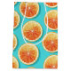Um padrão de fatias de laranja frescas e suculentas em tons profundos de laranja tangerina e laranja vermelha, com textura aquosa que lhe dá aquele aspecto recém cortado. Eles são colocados sobre um fundo azul brilhante para um visual brilhante e de verão.