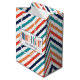 Listras coloridas retrorreflectoras com bolsa de presente de "Feliz e Brilho" tipografia.