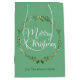Linda escrita branca e cursiva lendo Feliz Natal está rastejado sobre uma elegante coroa sagrada com bonito amêndoa verde. A caligrafia adorável sobrepõe as vinhas de férias ao seu texto personalizado. Saco de presente personalizado perfeito para uma família com seu nome e ano. Bons presentes verdes e claros.