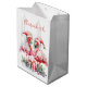 Esta bolsa de presente de feriado bonito apresenta flamingos bonitos em Chapéus de Santa com presentes em tons de aquarela macia de rosa, vermelho e verde. Personalize com sua escolha de texto especial de feriado na frente e atrás.