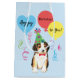Feliz aniversário saudações com este design bonitinho com um feliz e festeiro cachorro Beagle vestindo chapéu rodeado por balões coloridos e galerias. Feliz Aniversário, [nome]" na frente e "Feliz Aniversário para Você!" nas costas. O nome pode ser facilmente alterado; basta clicar no botão personalizar.