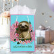 Uma preguiça bonita sentada entre flores cor-de-rosa contra um pano de fundo azul