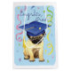 Felicite seu formando favorito com um presente em um saco que caracteriza um bonito, pouco, formando feliz do Pug que veste um mortarboard entre uma agitação dos confetes.