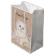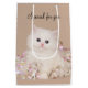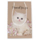 Gatinho branco persa, incrivelmente bonito, com um presente pastel, enrolando uma fita, tentando convencê-la a brincar de amante de gato qualquer oportunidade.
