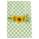 Este design de campo/fazenda tem um belo e brilhante buquê de girassol de cor amarela e um prato de xadrez verde e branco pastel.