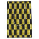 Abstract graphic of geometric design, displays textured, gold panels, shaded with brown, yellow, and white-layered with panels of black, and digitally, arranged in a checkerboard pattern.