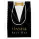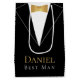 A parte superior sugere um terno preto elegante com camisa branca e gravata borboleta dourada de folha de ouro falsa. Na parte inferior, o nome está escrito em letras maiúsculas douradas, com as palavras Padrinho abaixo em letras maiúsculas brancas menores.