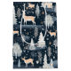 A lush winter landscape with tan colored deer roaming amongst deep blue fields of falling snow covered with pine trees and village houses.