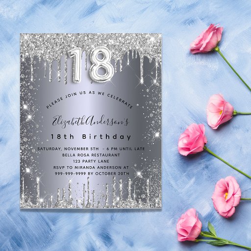 Elegante, clássico, glamouroso e feminino para uma 18ª festa de aniversário. Um fundo metálico prateado. Decorado com pó de brilho. Personalize e adicione um nome. Com o texto: Parabéns. O nome é escrito com um moderno estilo escrito à mão. O número 18 é escrito com uma fonte no estilo do balão.