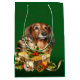 O dachshund vermelho de cabelos compridos e leve idoso senta-se orgulhosa por seu saco do presente de época natalícia do Natal dos amantes do cão dos presentes do Natal