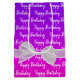 Feliz texto de aniversário e arco branco em fundo de gradiente rosa e roxo neon. O texto é editável ou pode ser excluído.
